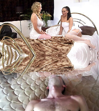 Two bombshell lesbian girls Octavia Red and Rissa May indulge in a spunky romp with licking and fingering