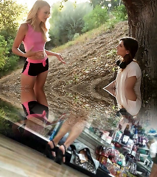 Sizzling Blonde Ginormous Tits MILF Mom picks up a Uber-cute Small Tits Girl from the Street to get her Pussy Licked to Intense Orgasm