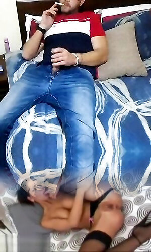 Stockinged brit voyeur instructing gimp to tug