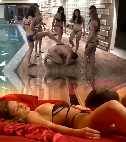 esclave joschi de coup de pied de gang de femmes dans la piscine